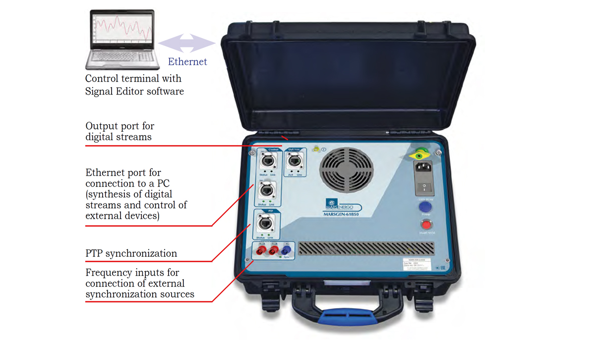 The calibrator MarsGen-61850 generates sampled value (SV) streams in accordance with IEC 61850-9-2 for direct calibration and testing of digital-input measurement instruments. The device provides accurate synchronization to the UTC time base and complies with stringent specifications for packet timing, stream continuity and time synchronization accuracy.